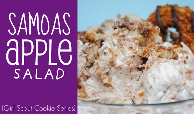 Samoas Apple Salad posted by Staff Writer Pin Share Tweet Email This Samoas Apple Salad is so great. So easy. And SO Samoas! And I do mean so samoas. As in: an entire box. I was super excited to do this Girl Scout Cookies series, but I was also a little afraid that I might run out of ideas trying to spread out one cookie over an entire week. SO. NOT. THE. CASE. If anything, I can’t get my brain to stop thinking GS Cookies. Ever. It’s actually been kind of awesome. (a little sleep depriving, but awesome) If you ever have “bloggers block”, pick a theme to follow for a week– that should do the trick! Anyway. As promised: my extra post for Samoas Week….. You’ve probably heard of Snickers Apple Salad. I think that’s a pretty well-known thing, right? I tried it for the first time a couple of years ago. Ah-mazing. Love it. It’s the easiest thing ever, but I never make it. I sit there and think, “oooooh, remember that snickers apple salad?” And that’s about the extent of the thought/action process. The other day, as I was scanning Pinterest for recipes that I thought could be turned “Girl Scout Themed,” I ran across that Snickers Apple Salad recipe, and realized that Samoas would make an absolutely amazing substitute for the Snickers! I know I’m always right, but sometimes I surprise my self at HOW right I am. (My husband is somewhere fighting the unexplainable urge to roll his eyes right now.) This Samoas Apple Salad is so great. So easy. And SO Samoas! And I do mean so samoas. As in: an entire box. If you can’t part with the whole thing, half the recipe 🙂 I’ll understand. Samoas Apple Salad 6018192 Ingredients: 1 box Samoas (or Keebler’s Caramel Delights) 1 – 8 oz Cool Whip Lite 1 small box vanilla instant pudding 1 1/4 c. milk 5 medium apples (granny smith is best) Optional: chocolate syrup for drizzling, and toasted coconut for garnish Instructions: Whisk together the milk and pudding mix until thickened. Immediately whisk in the cool whip. Using the paddle attachment of a stand mixer, mix the pudding mixture and the cookies on high– so that the cookies are crushed up really well and incorporated. Core and dice the apples, add into the bowl. Rough chop remaining (reserving 1-2 for garnish) cookies, add into the bowl. Using a rubber spatula, mix until all ingredients are coated in the pudding mixture. Optional: garnish with crumbled cookies, toasted coconut, and a drizzle of chocolate syrup. Refrigerate until serving. More Samoas Recipes: Samoas Cookie Recipe Roundup Samoas Pudding Mousse Samoas Fudge Samoas Dip