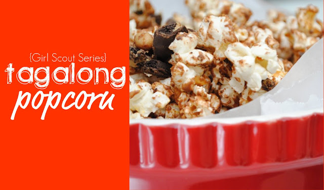 Tagalong Popcorn Recipe posted by Staff Writer Pin Share Tweet Email Tagalong Popcorn Recipe, peanut butter and chocolate chips, tagalongs, peanuts and popcorn. O M G. So good. Can’t stop. I know I’m not getting any originality points for this recipe (as the existence of Thin Mints Popcorn and Samoas Popcorn has been pretty heavily documented on Pinterest lately)– but I just couldn’t resist doing a dessert popcorn recipe for my Girl Scout Cookies series. And Tagalongs totally fit the bill! Blasphemous as this sounds: there are certain Peanut Butter and Chocolate foods that I’m not in love with, because they’re a little too rich for me. I know. Total *gasp* right? It’s true though. And…. now, this is hard to say… Tagalongs are one of those desserts. I like them, I daresay, a lot. But, love them? ehhhh….. It’s just a teensy too much peanut butter for me sometimes… which is why I’m LOVING the recipes I’m posting this week, especially this one– they kind of spread the peanut butter love, just enough for me 🙂 It comes together so quickly, with relatively little mess– always a plus. Enoy!! Tagalong Popcorn 6019205 Ingredients: 1 bag popped popcorn, kernels removed 1/2 c. peanut butter and chocolate chips, melted tagalongs* (desired amount) peanuts (desired amount) Instructions: Mix together the melted chips and the popped popcorn in a large bowl. Use a rubber spatula to stir until popcorn is mostly coated. Roughly chop or crumble tagalongs (I used about 10) into the bowl. Roughly chop up peanuts (I used a small handful) and add to the bowl. Mix again, until tagalongs and peanuts are incorporated evenly(ish) throughout the popcorn. Spread on wax paper to cool and harden chocolate (you could also refrigerate for faster results). *Keebler has a great substitute for tagalongs! So does Oreo– if you don’t mind a chocolate wafer cookie instead of the shortbread cookie. More Girl Scout Cookies Recipes: Thin Mint Magic Cookie Bars Samoas Dip Thin Mint Diet Coke Cake Samoas Pudding Mousse